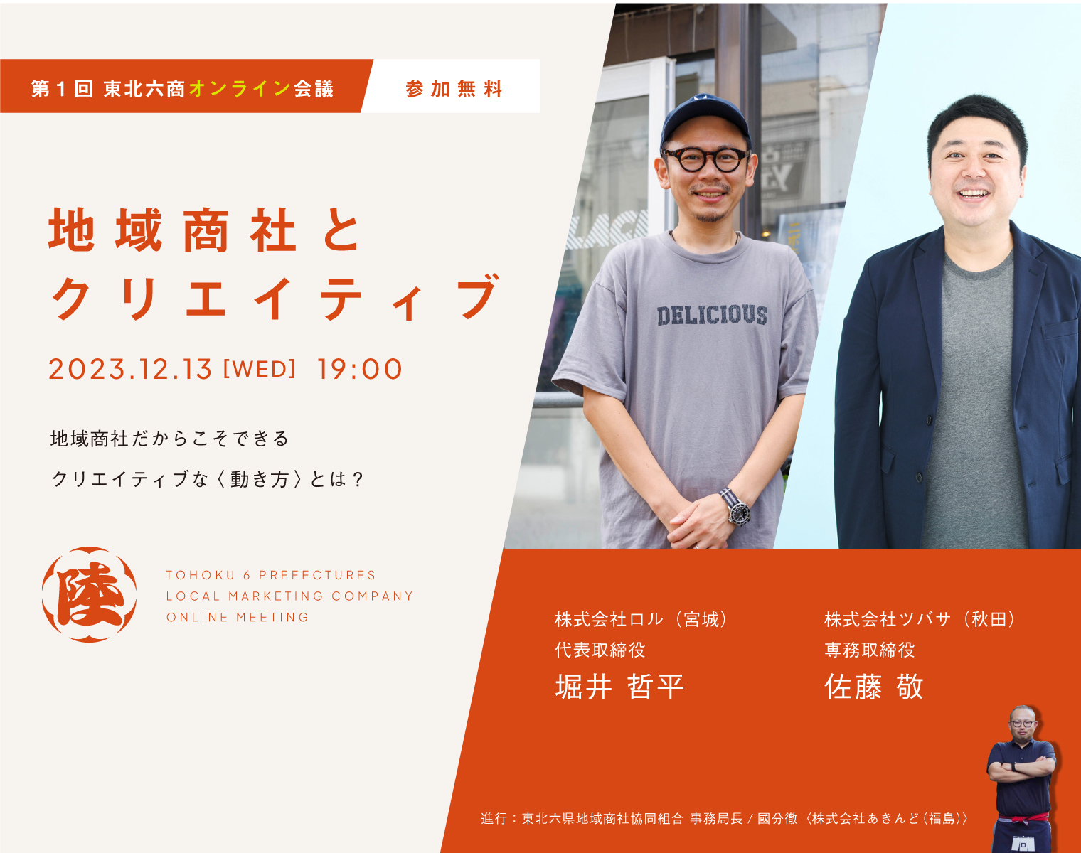 これまで東北各地を回りながらリアルな東北商人たちの交流の場を創出してきた東北六商会議を、オンラインにて開催します。毎回トークゲストをお招きし、東北の地域商社活動の今をお伝えしていきます。第1回は「地域商社とクリエイティブ」というテーマでお送りします。参加は無料です、皆様のご参加をお待ちしております。