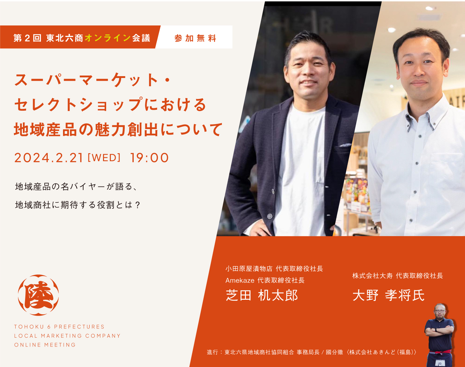 毎回面白い商人をトークゲストとしてお招きし、東北の地域商社活動の今をお伝えしていく東北六商オンライン会議を2月21日(水)に開催します。